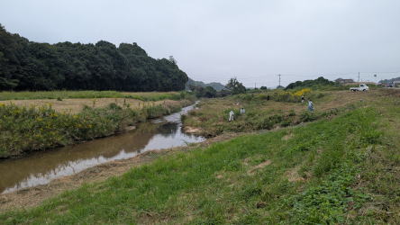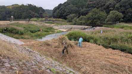 川崎町・鮎返り地区で草刈り作業が行われました! 中元寺川 鮎返り クリーン大作戦 主催 中元寺川 鮎返り クリーン大作戦実行委員会 11月12日(日)、川崎町の鮎返り地区(町指定天然記念物)で、地域の皆さんによる草刈り作業が行われました。 この場所は、中元寺川の「甌穴群(おうけつぐん)」と「ネコヤナギ群生地」として知られ、川底には自然がつくり出した丸い穴が見られ、春には可愛らしいネコヤナギが川辺を彩ります。 今回は、この美しい川辺を守るため、鮎返りから約300メートル上流までの区間で草刈りが実施されました。 事前の下準備で刈られた草を集めたり、運び出したりと、参加した皆さんは汗を流しながらも笑顔いっぱい。 川のせせらぎを聞きながら、地域の自然を大切にする気持ちがひとつになった一日となりました。 |