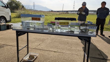 記録用の写真を撮り忘れてしまいましたが、川の状態は落ち着いており、日頃の地域の皆さんの取り組みが反映されているように感じます。 また、今回の調査では、これまで笹尾川で3種類のエビしか見たことがなかったのですが、新たにもう1種類のエビを確認することができました。生きものの多様性を感じられる嬉しい発見でした。 魚類では、毎回見ることのできるカネヒラやオイカワも元気に泳いでおり、その美しい体色に、参加者からも思わず笑顔がこぼれました。 今後も継続して調査を行い、笹尾川の自然の魅力と健やかな環境を伝えていきたいと思います。 |