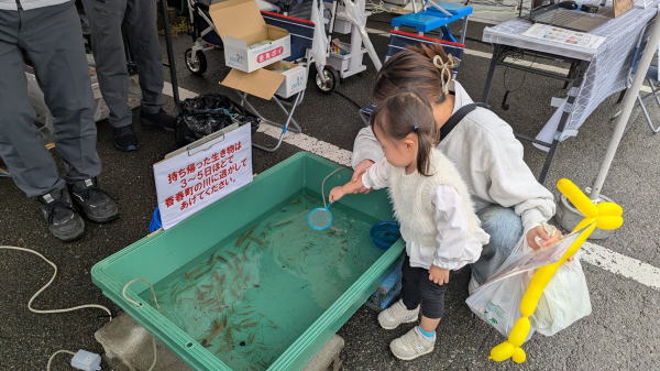 会場では、「金辺川を楽しむ会」の皆さんが、金辺川に棲む魚の展示や、ハヤ(遠賀川ではオイカワやカワムツなどの幼魚の総称)などの小さな魚を釣る体験コーナーを行いました。金辺川の紹介や「知っている魚」についてのアンケートも実施され、川のことを楽しく知る時間となりました。